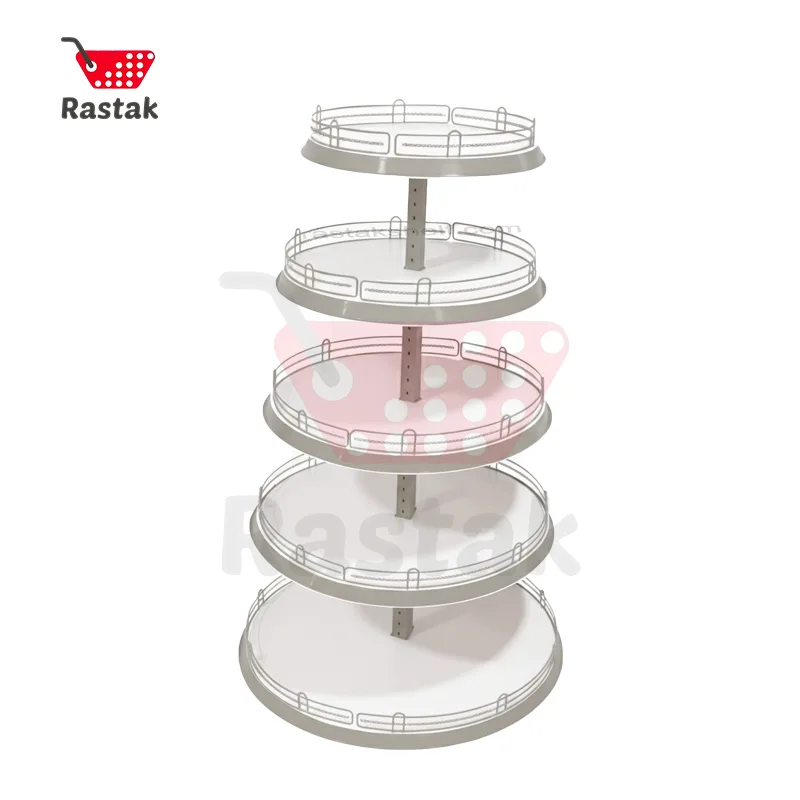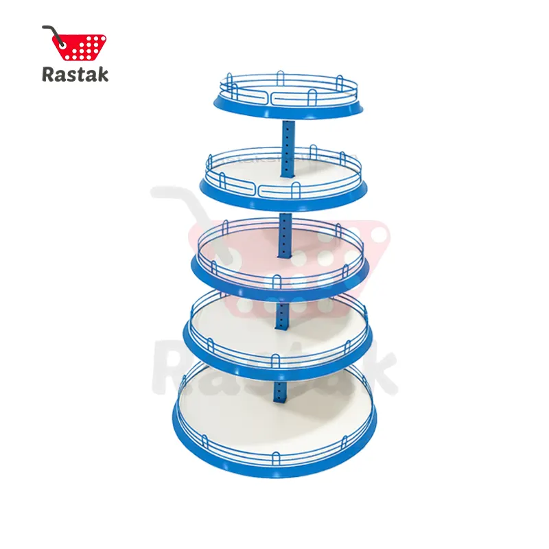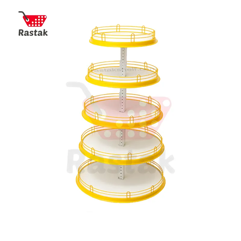 نمایش جزیرهای استند گرد کیکی 5 طبقه فلزی باعث میشود مشتری بدون محدودیت از هر سمت به کالا دسترسی داشته باشد و همین موضوع افزایش فروش کالاهای پرفروش را سادهتر میکند.
