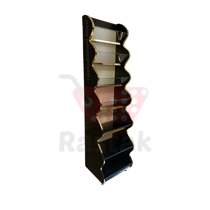 نوار طلایی براق در لبهها جلوهای لوکس و حرفهای به استند میدهد و فضای فروشگاه را از حالت ساده خارج میکند.